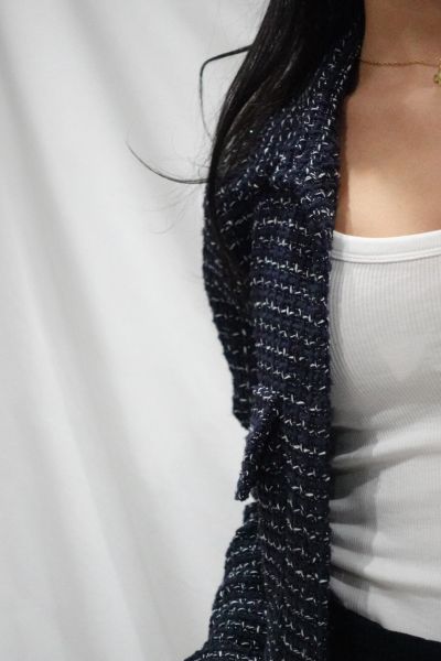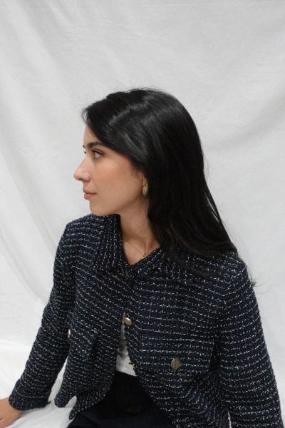 Chaqueta en 2 colores: negra y azul marino.Botones dorados y 2 bolsillos altos en la parte delantera. Es una prenda ligera y fácil de llevar. Toque plata en el hilo claro.